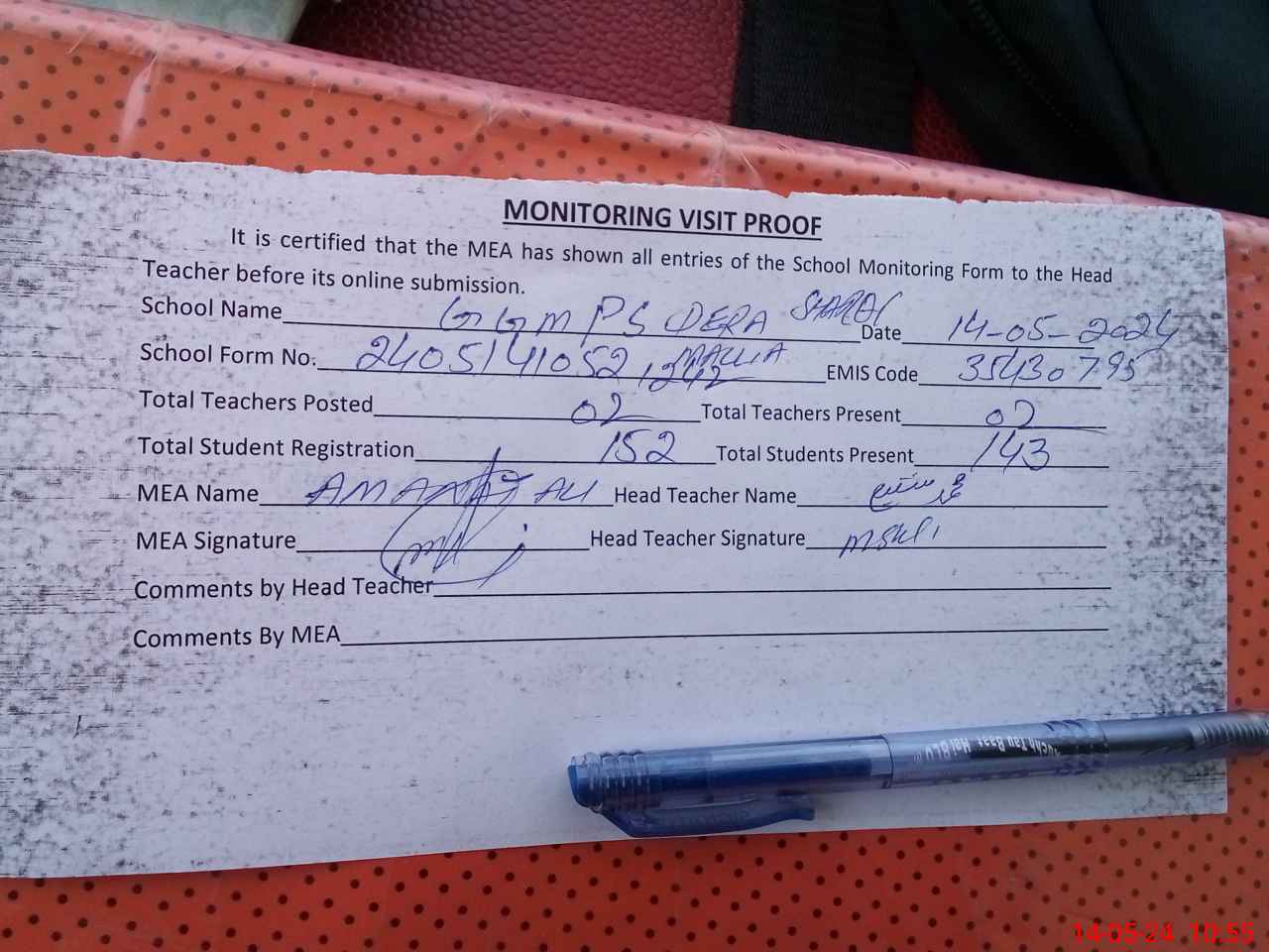 | Attendance Register | Head Teacher | MEA with School | Visit Proof |
