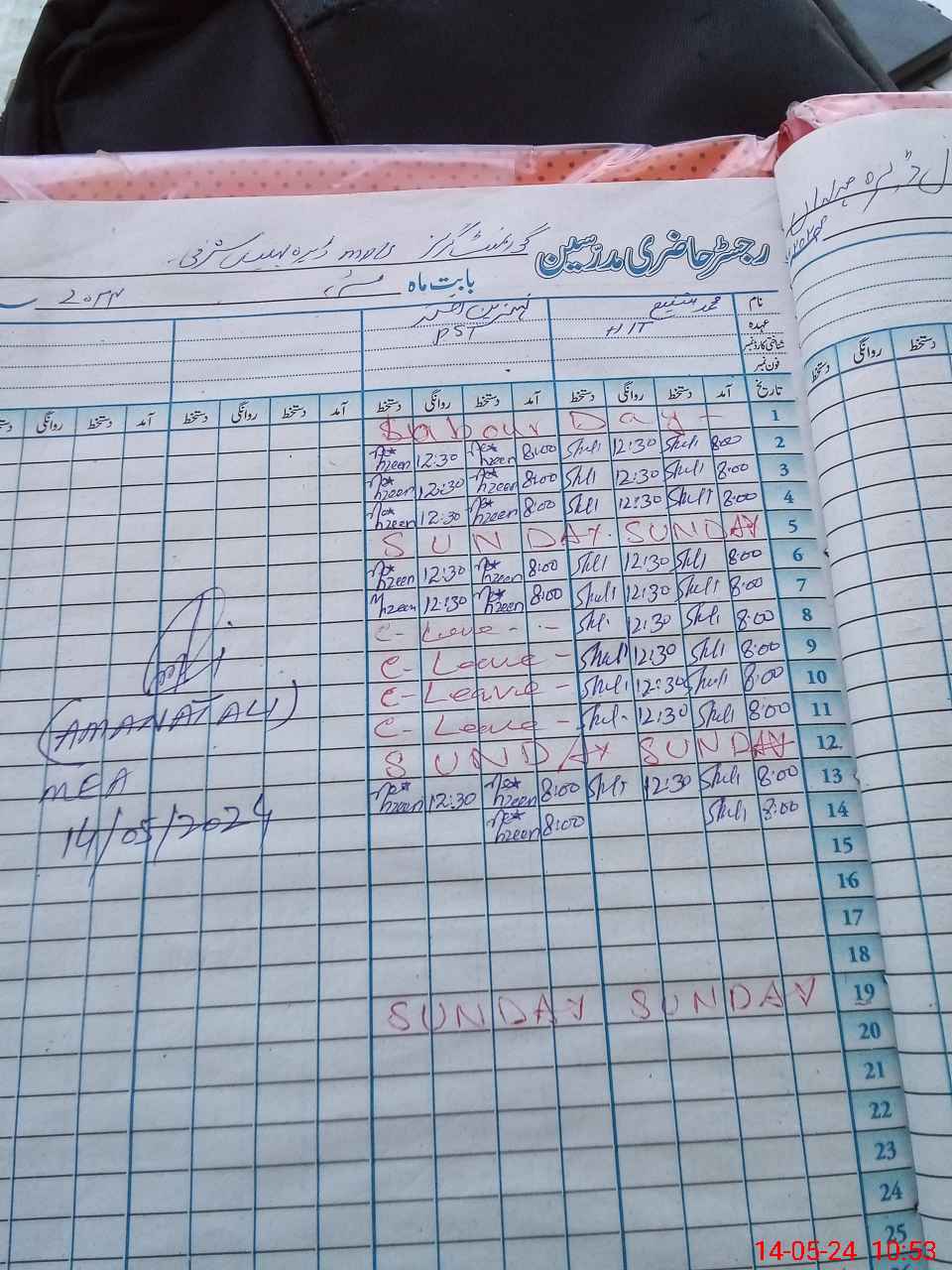 | CNIC | Full Name | Designation | R/C | Absence During Last Calender Month |