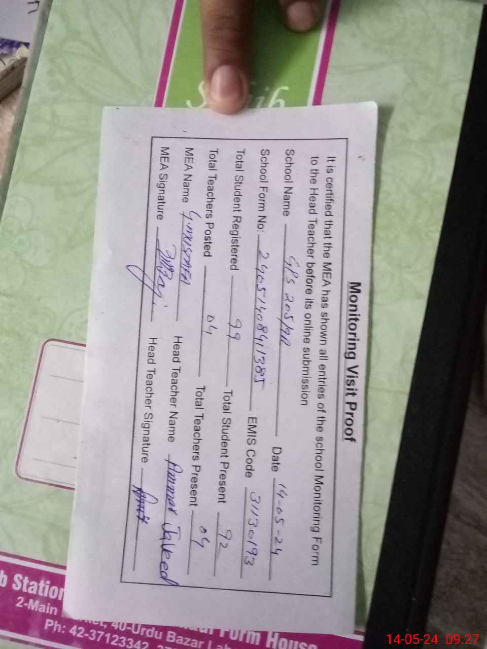 | Attendance Register | Head Teacher | MEA with School | Visit Proof |