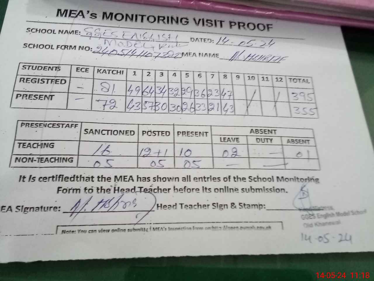 | Attendance Register | Head Teacher | MEA with School | Visit Proof |