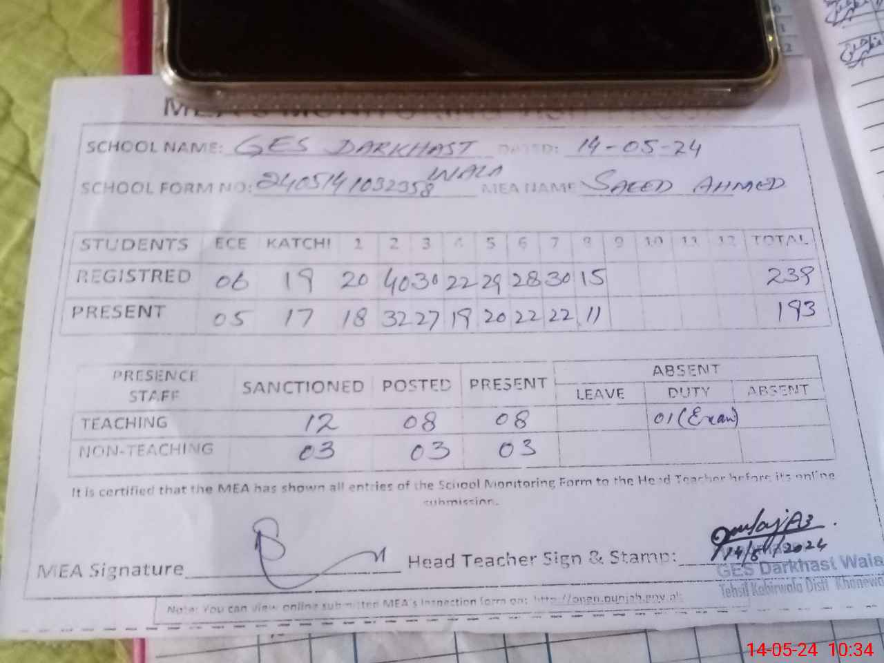 | Attendance Register | Head Teacher | MEA with School | Visit Proof |