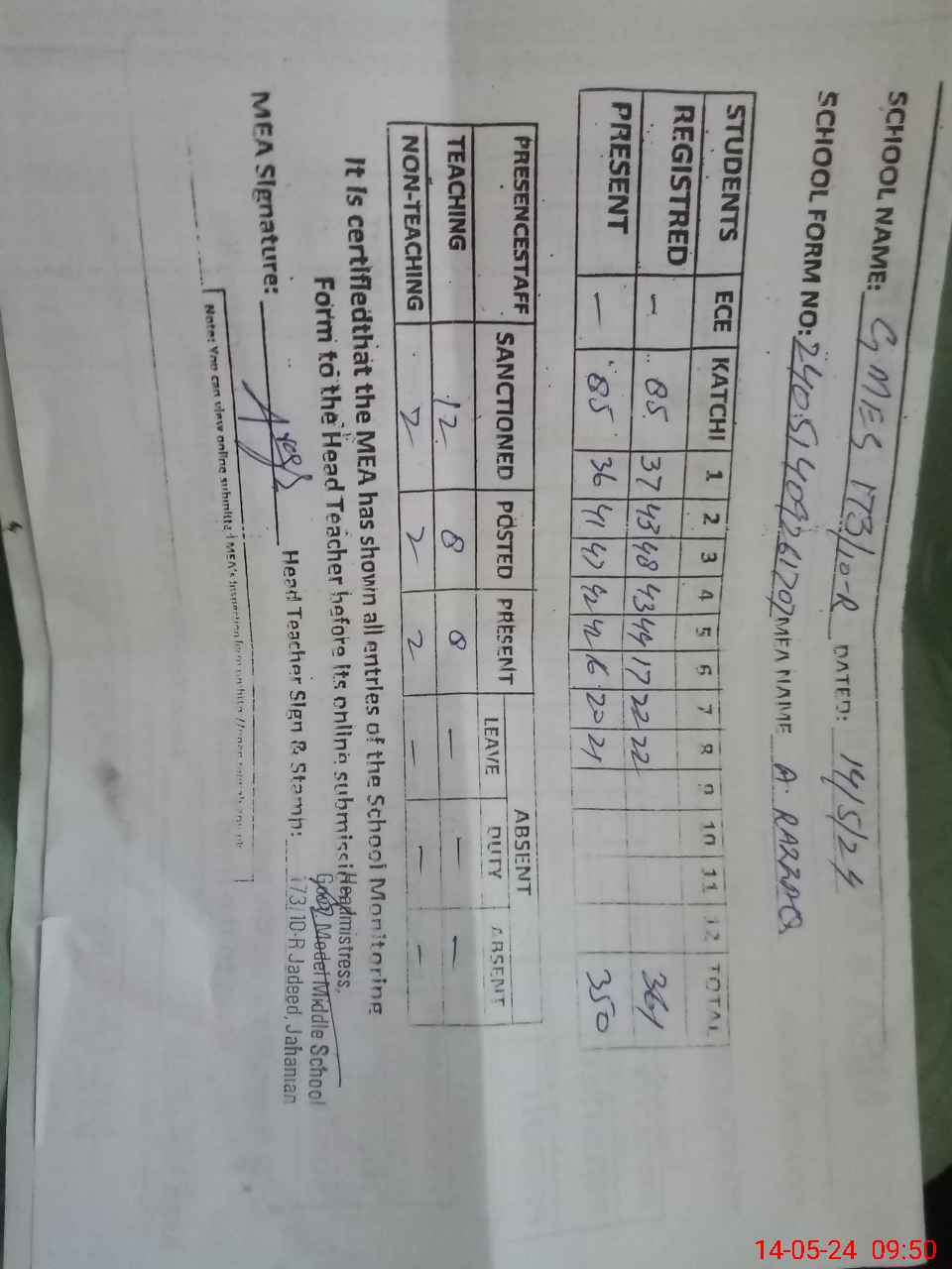 | Attendance Register | Head Teacher | MEA with School | Visit Proof |