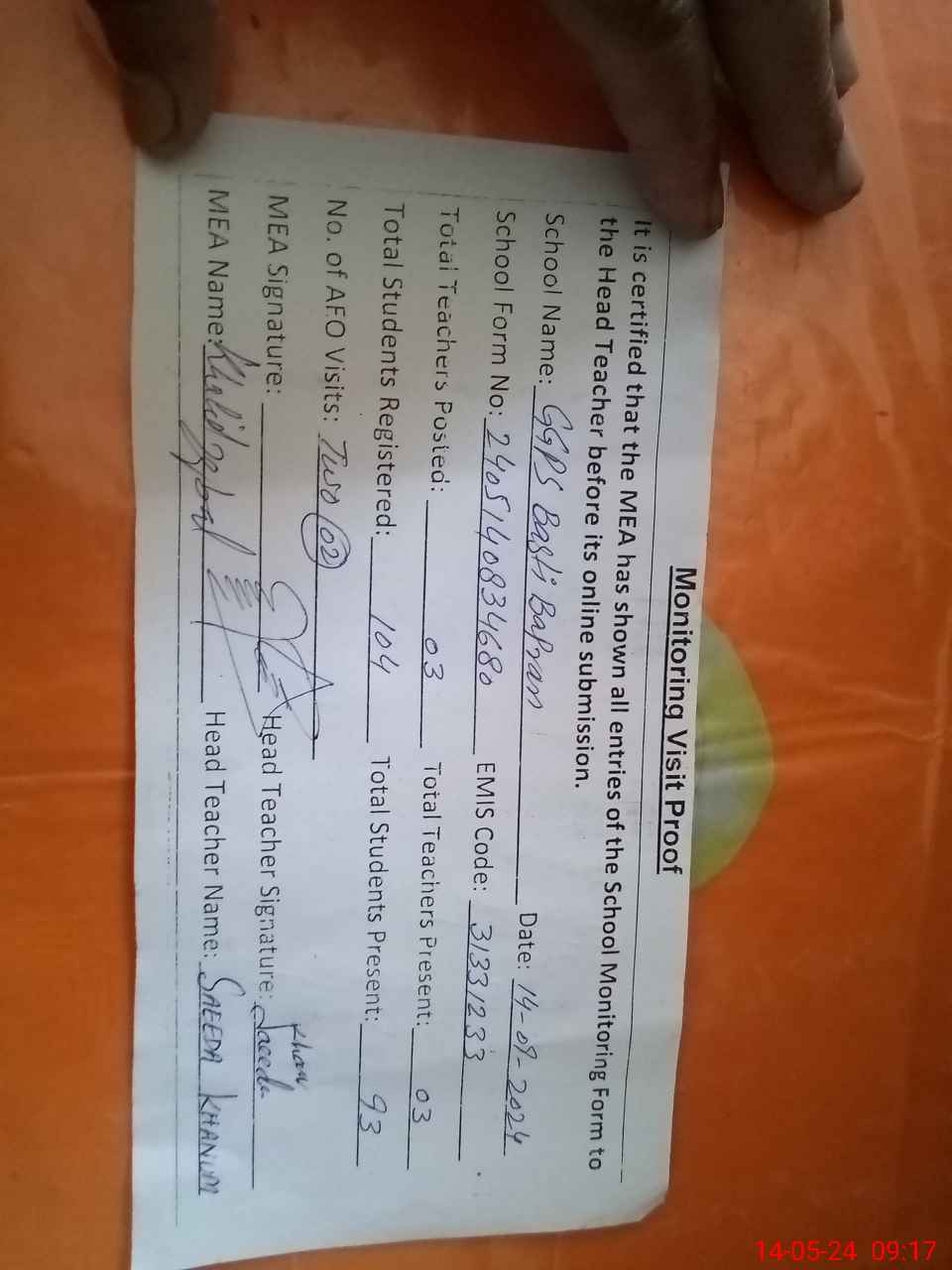 | Remarks (Use Separate Page if Required): Class verification is not updated on MEA tab as per sis and two classes are sitting in veranda and one class is sitting on open air | |||||