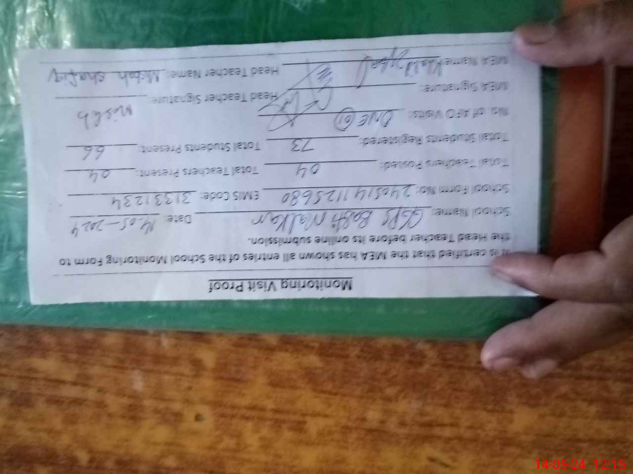 | Remarks (Use Separate Page if Required): Class verification is not updated on MEA tab as per sis and school is running in GPS basti malkan and two classes are sitting on open air | |||||