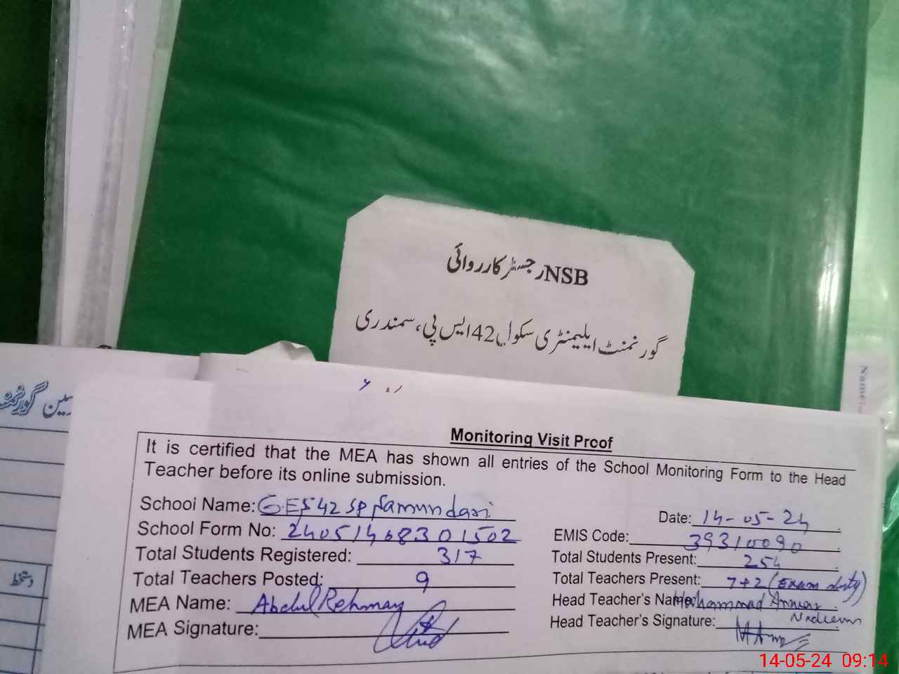 | Attendance Register | Head Teacher | MEA with School | Visit Proof |