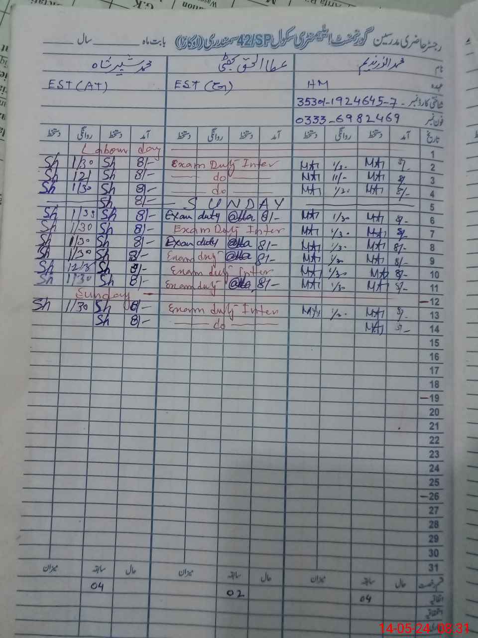 | 35**** | At**** UlHa**** Bh**** | 3 | 1 | 0 | 0 | 0 | 0 | 0 | 0 | 0 | 0 | 0 | Exam Duty |