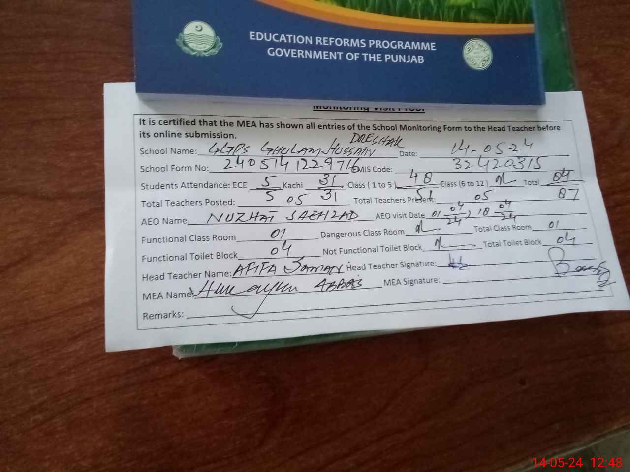 | Attendance Register | Head Teacher | MEA with School | Visit Proof |