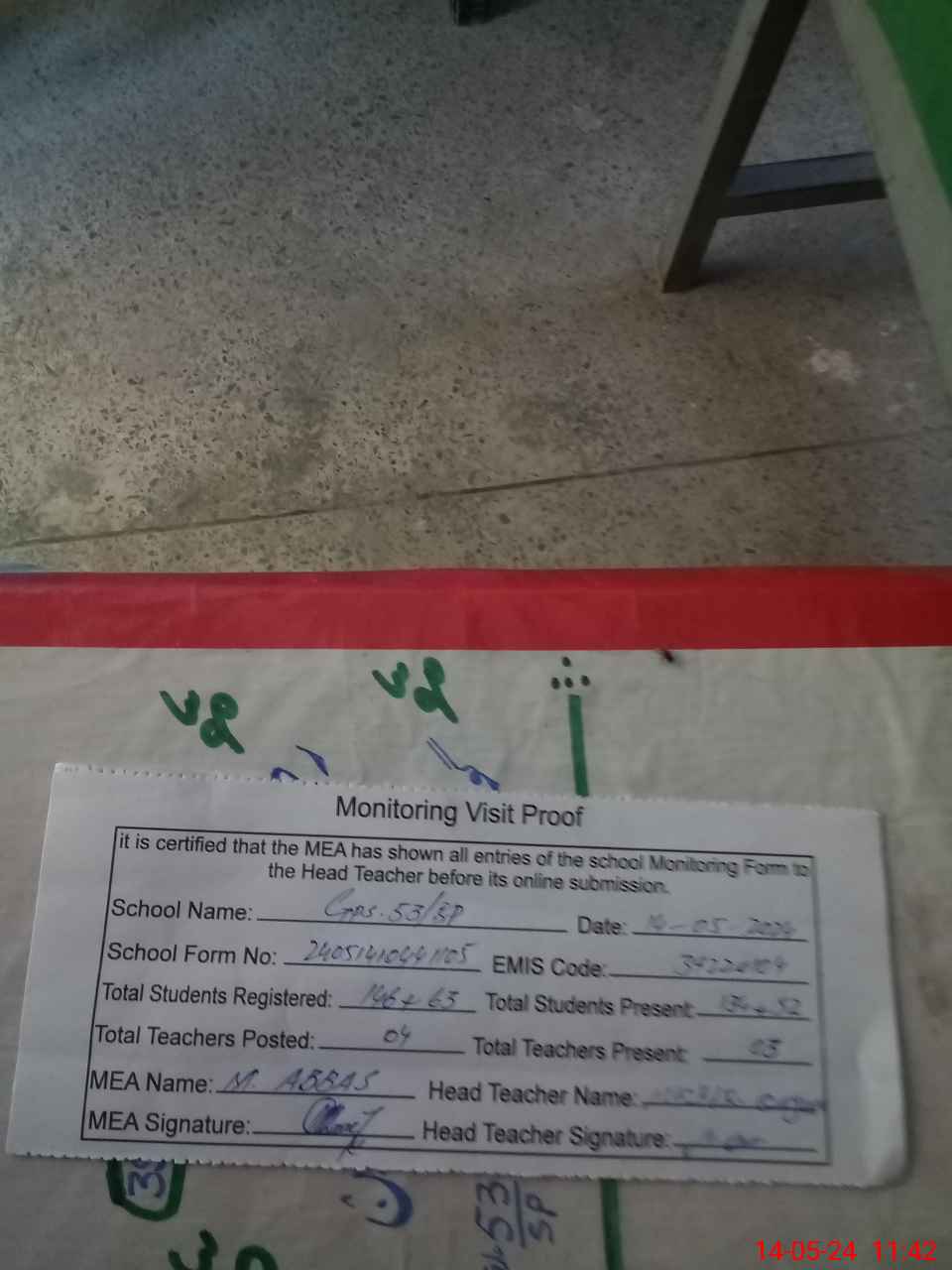 | Attendance Register | Head Teacher | MEA with School | Visit Proof |