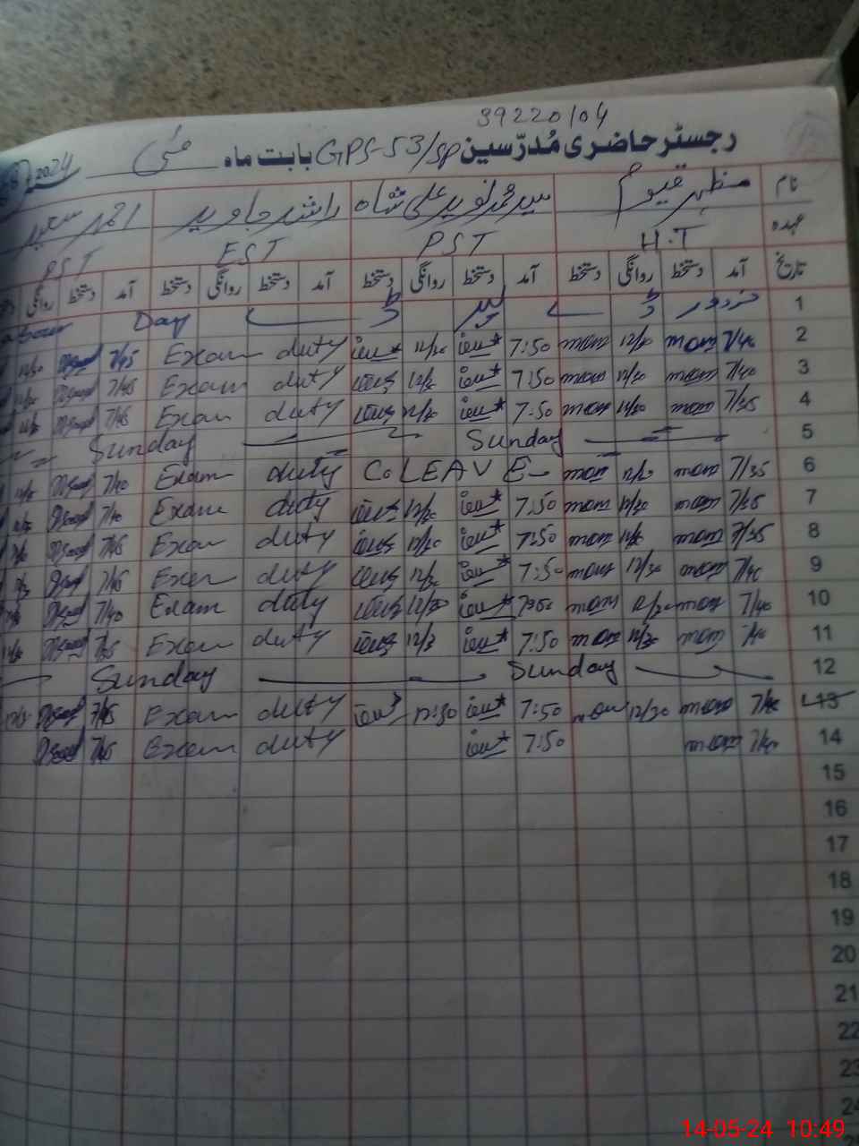 | 36**** | Ra**** Ja**** | Regular | 0 | 12 | 0 | 0 | 0 | 0 | 0 | 0 | 0 | Exam Duty | |