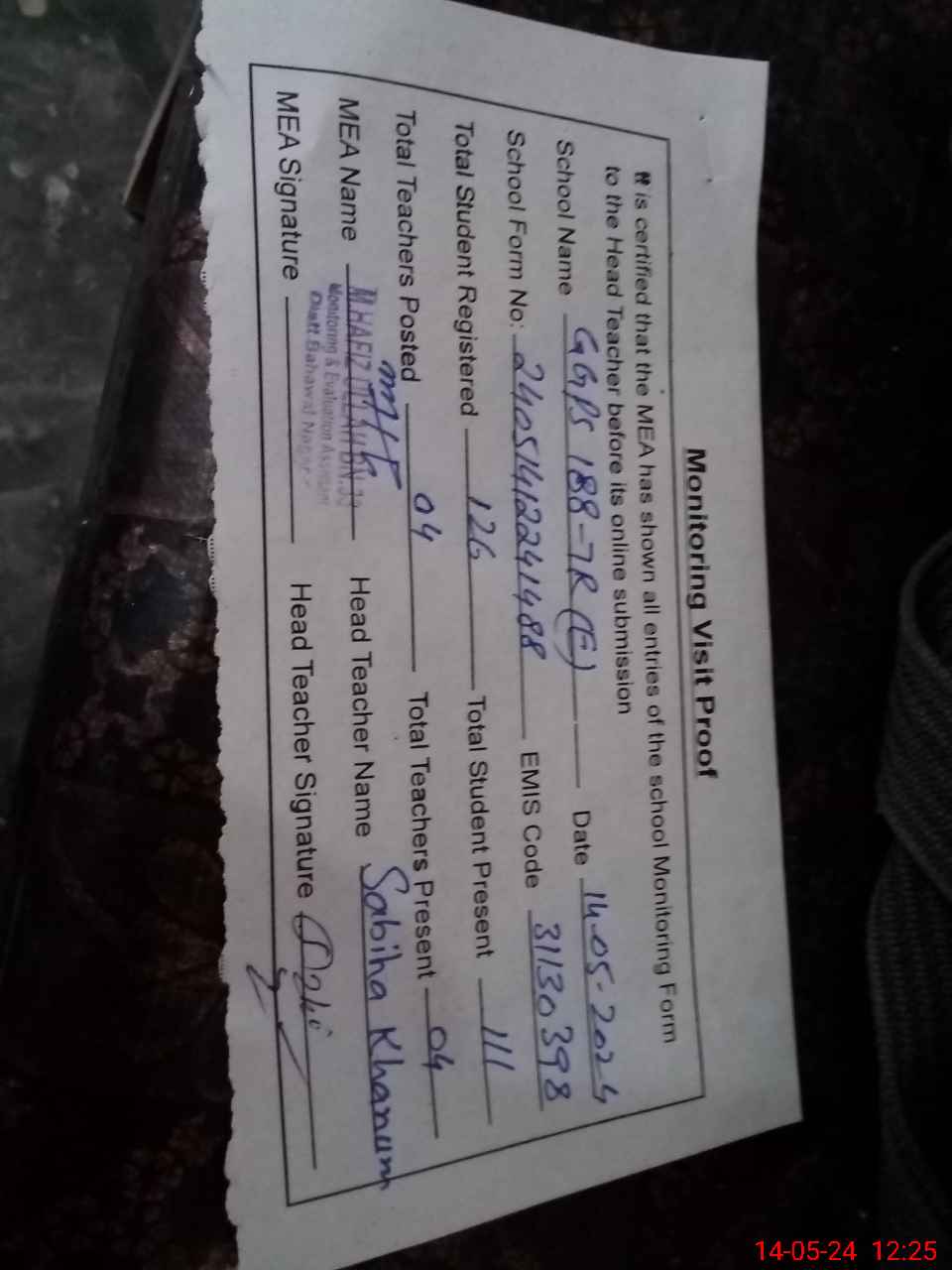 | Attendance Register | Head Teacher | MEA with School | Visit Proof |