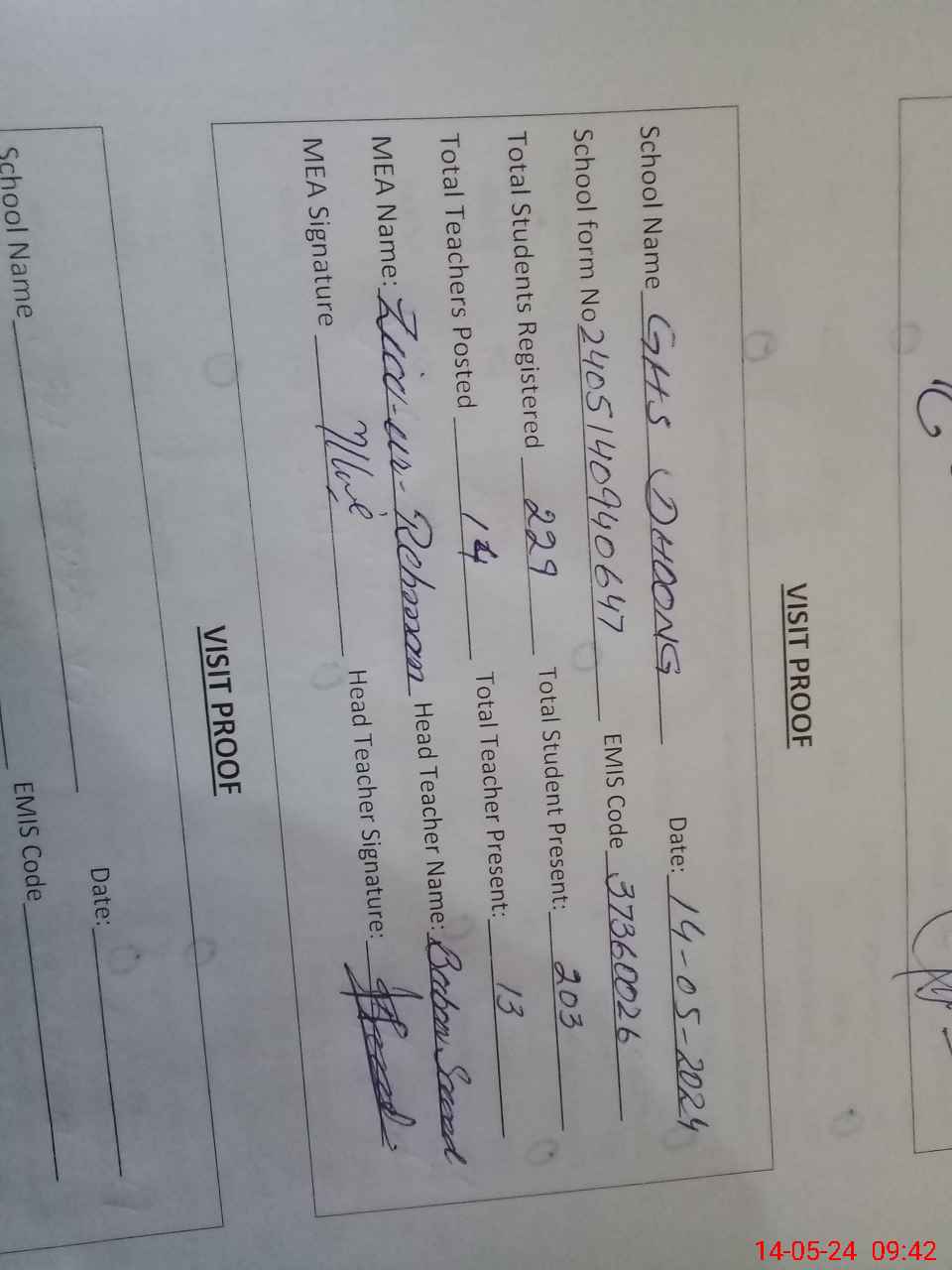 | Attendance Register | Head Teacher | MEA with School | Visit Proof |