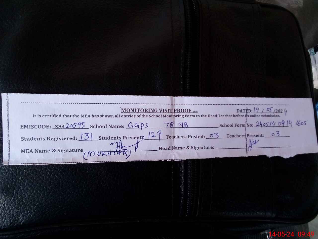 | Attendance Register | Head Teacher | MEA with School | Visit Proof |