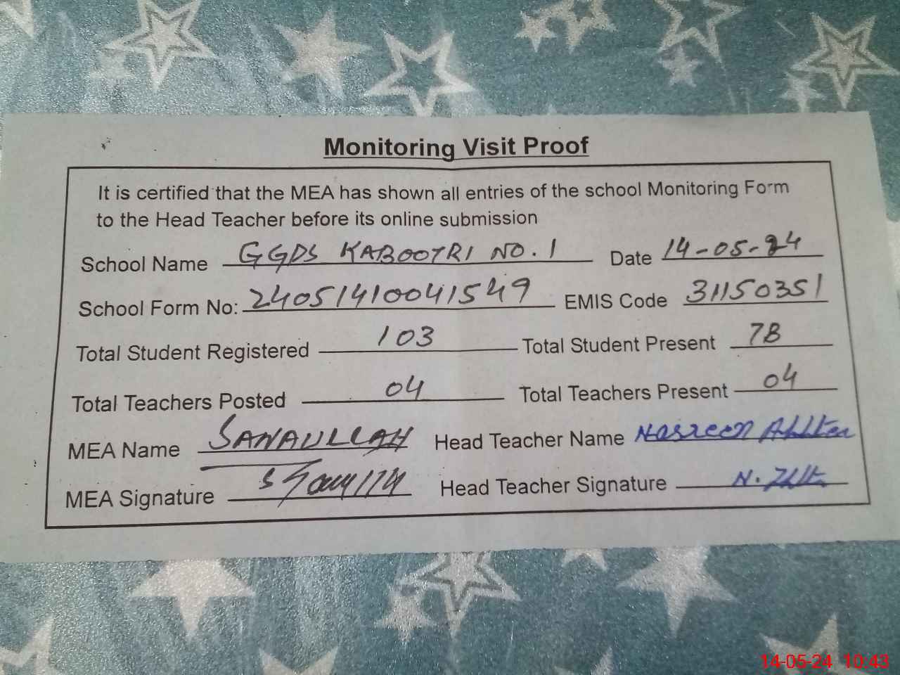 | Attendance Register | Head Teacher | MEA with School | Visit Proof |