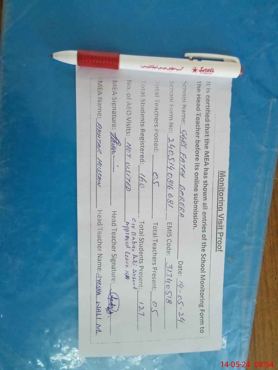 | Attendance Register | Head Teacher | MEA with School | Visit Proof |