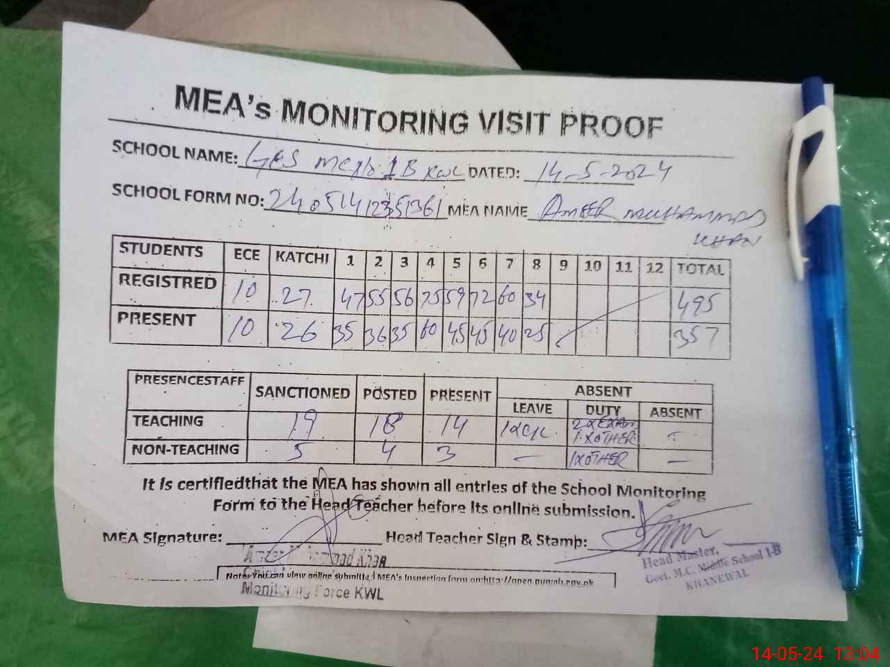 | Attendance Register | Head Teacher | MEA with School | Visit Proof |