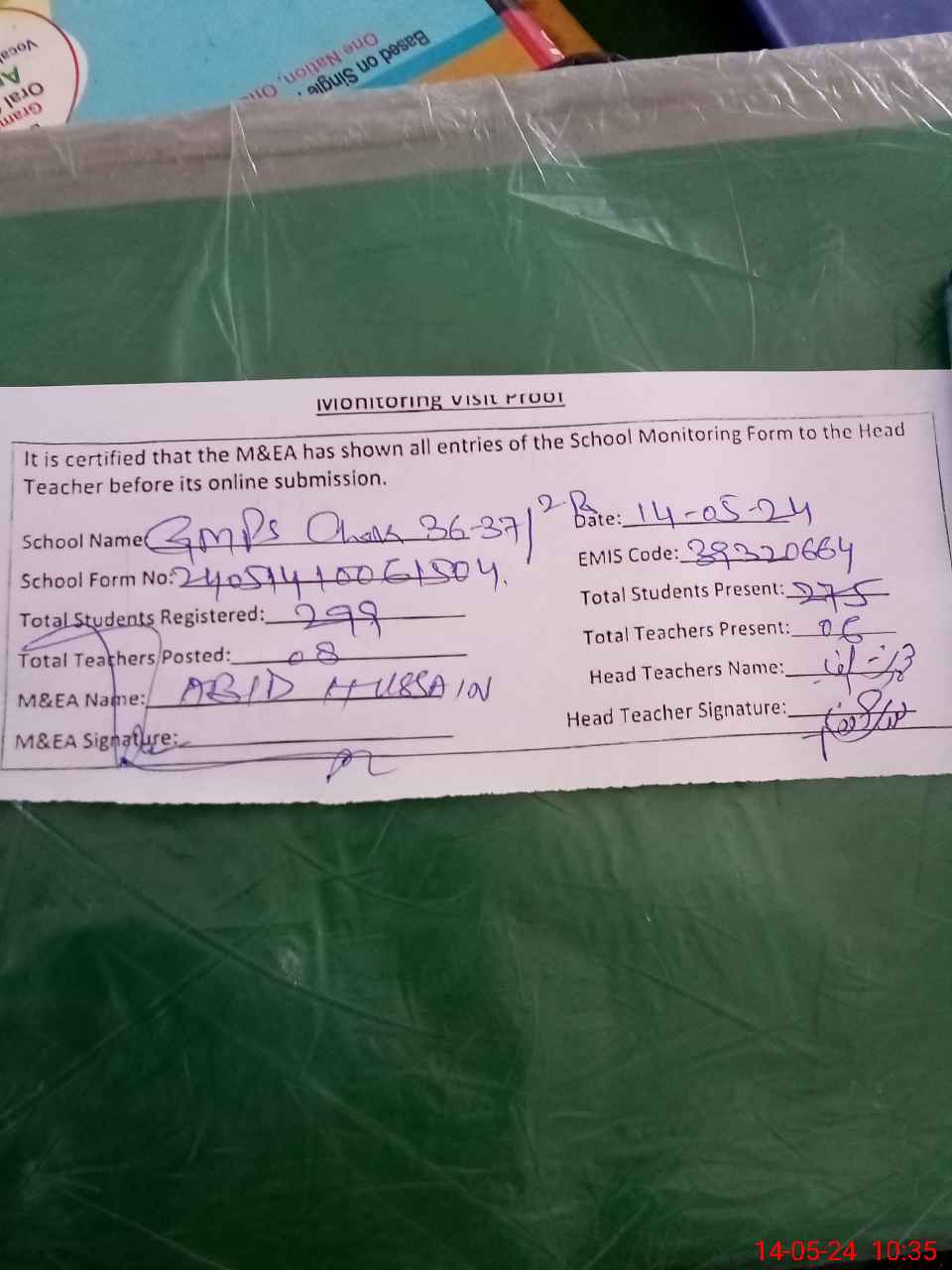 | Attendance Register | Head Teacher | MEA with School | Visit Proof |