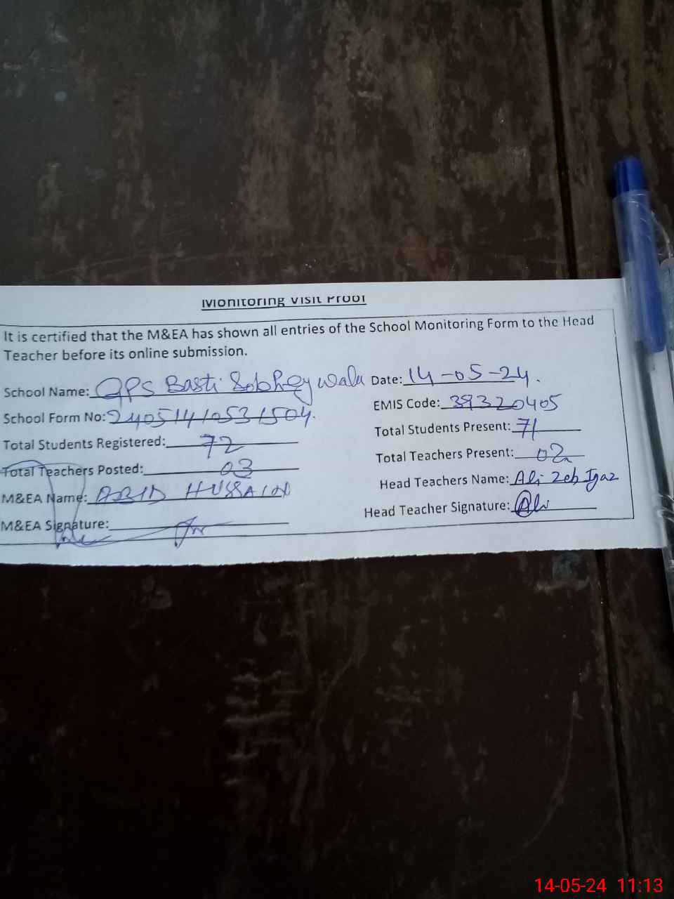 | Attendance Register | Head Teacher | MEA with School | Visit Proof |