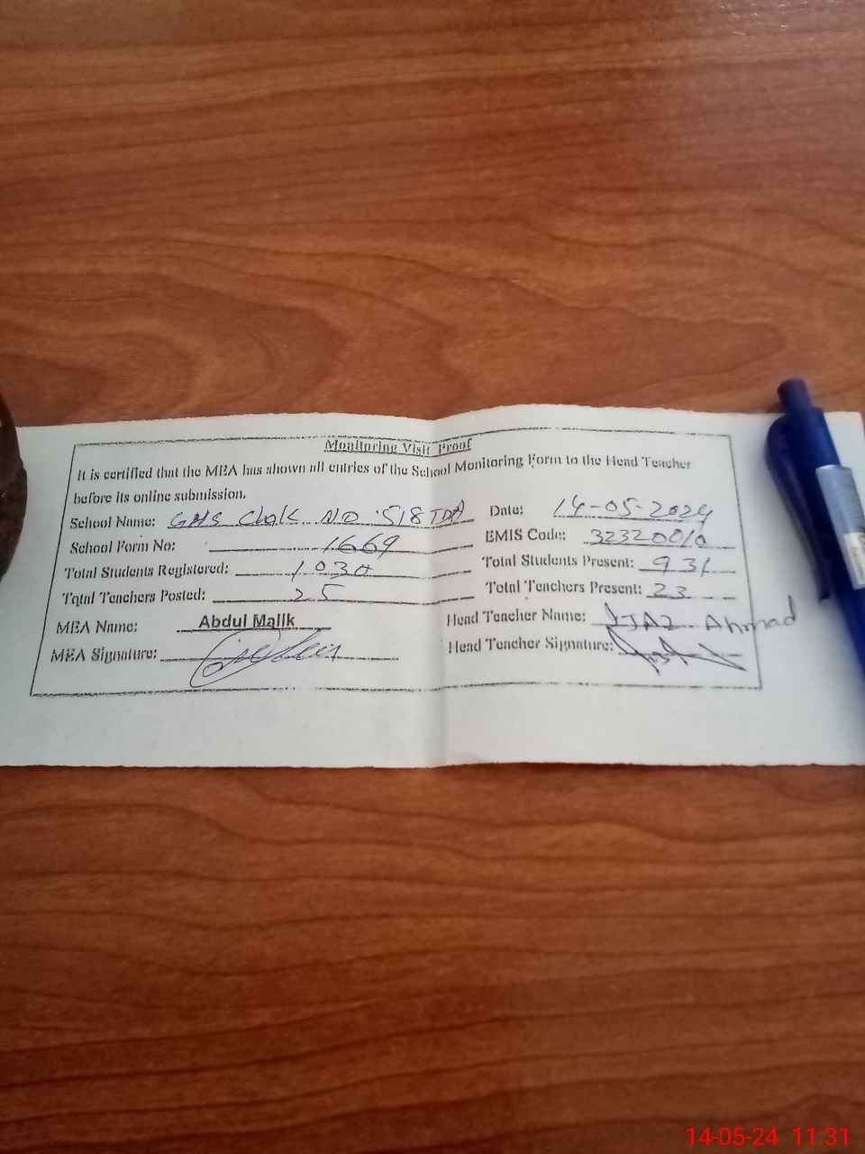 | Attendance Register | Head Teacher | MEA with School | Visit Proof |