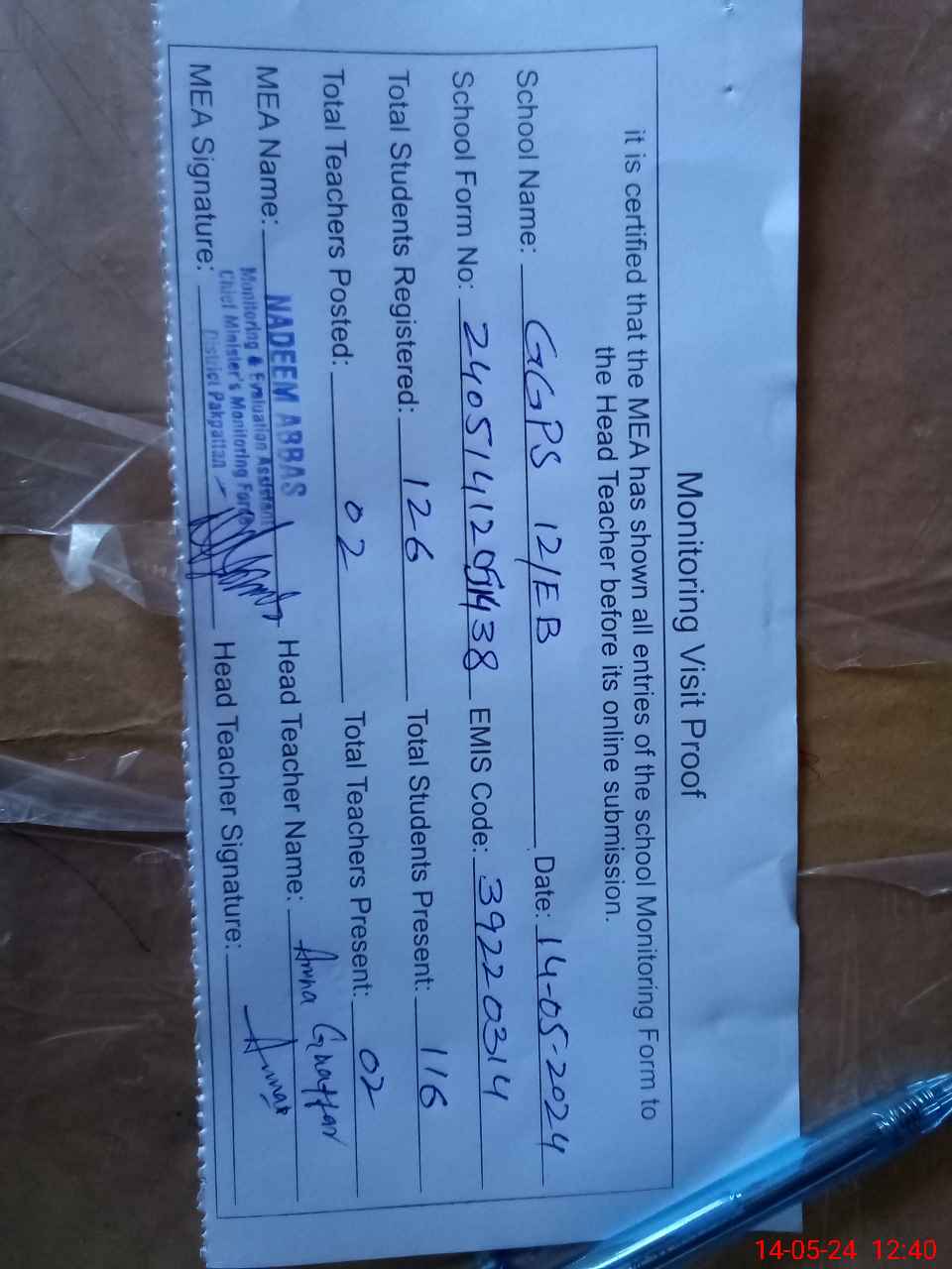 | Attendance Register | Head Teacher | MEA with School | Visit Proof |
