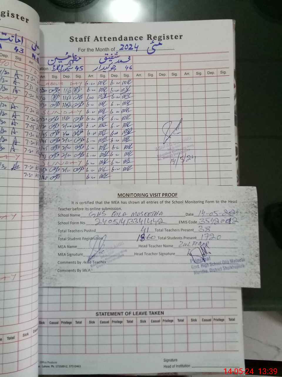 | Attendance Register | Head Teacher | MEA with School | Visit Proof |