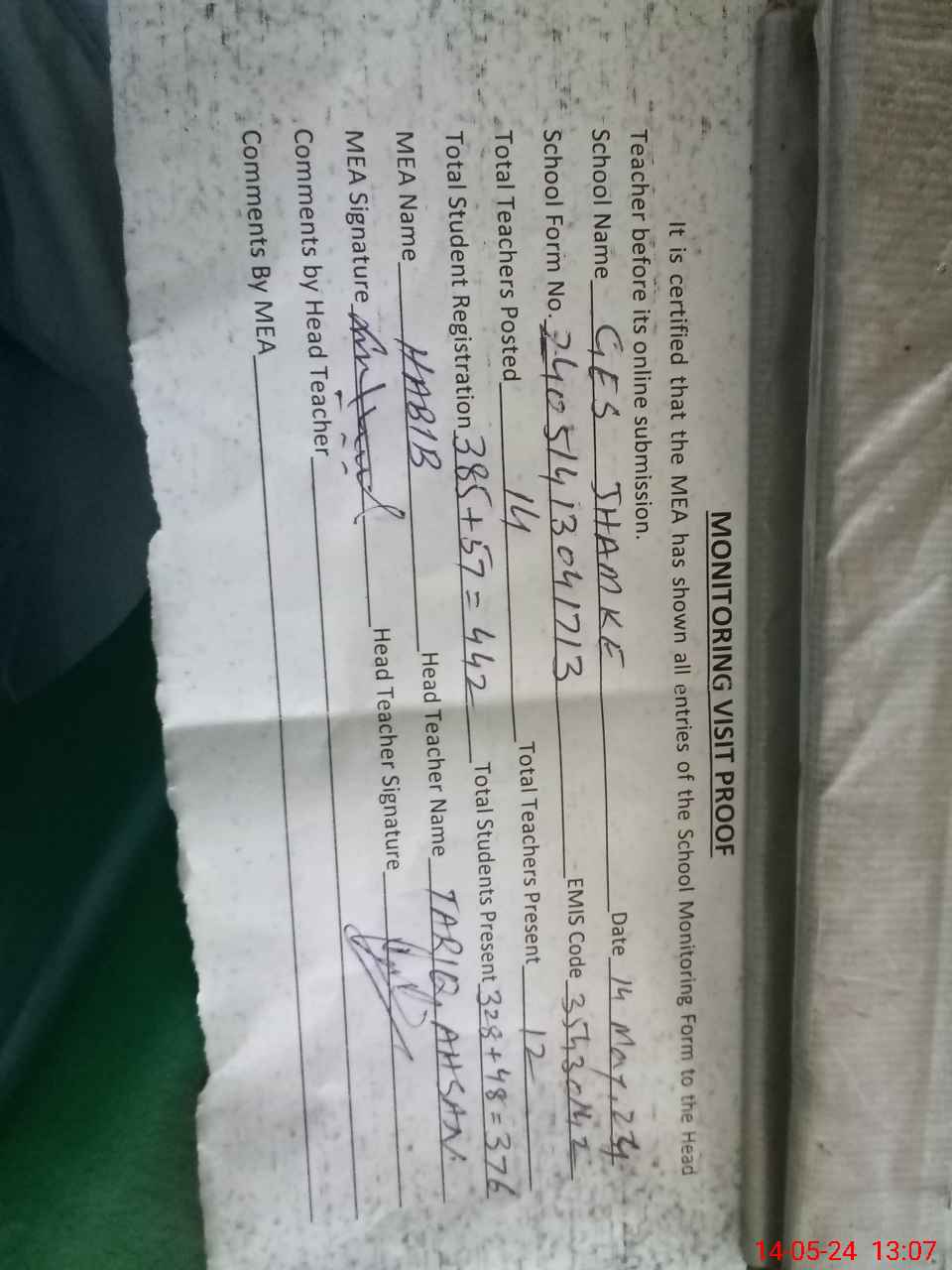 | Attendance Register | Head Teacher | MEA with School | Visit Proof |