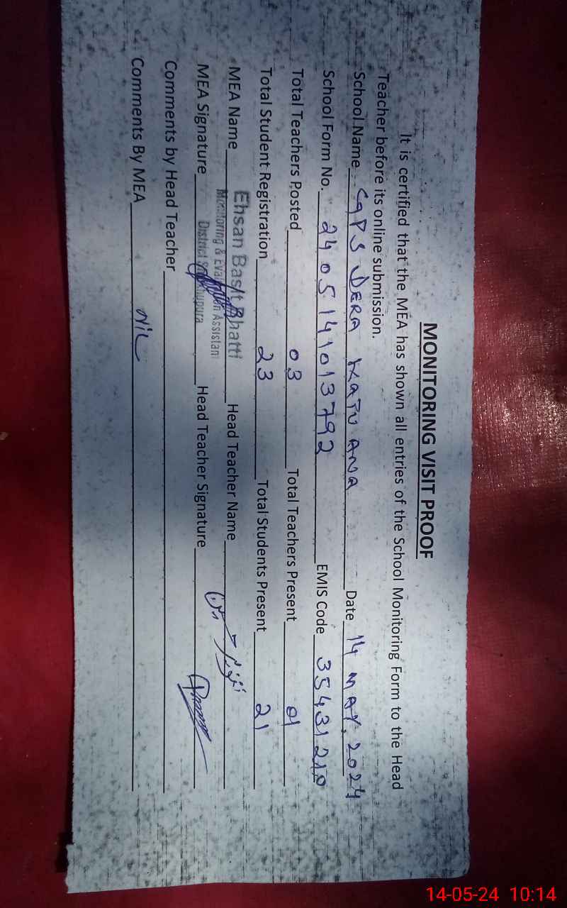 | EMIS Code: 35431210 | Name of School: GPS DERA KATU ANA | |||