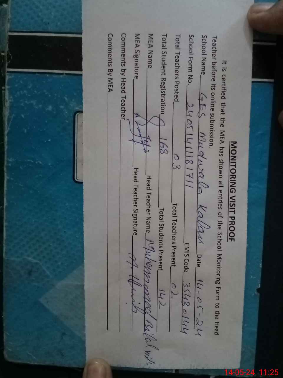 | Attendance Register | Head Teacher | MEA with School | Visit Proof |