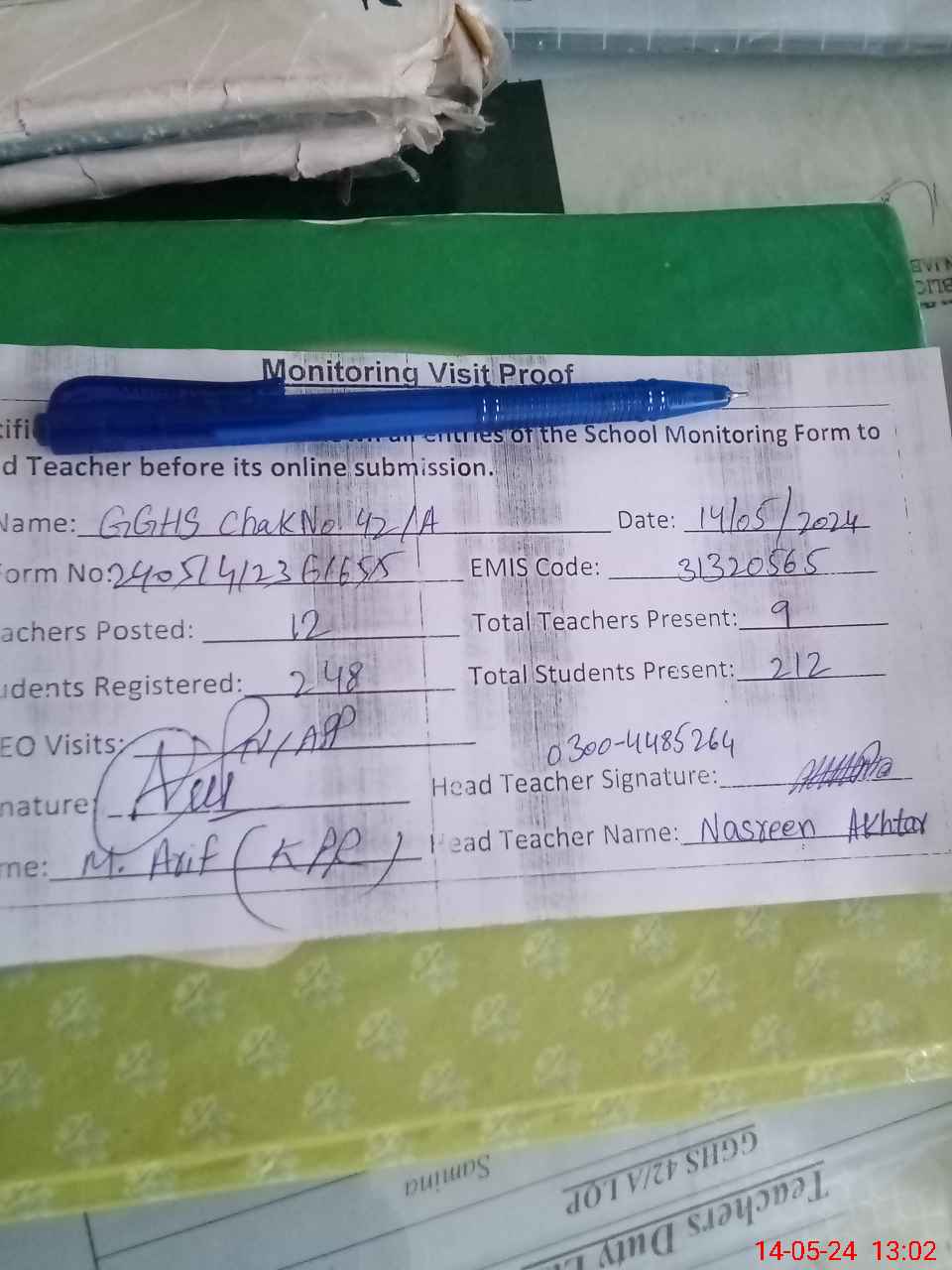 | Attendance Register | Head Teacher | MEA with School | Visit Proof |