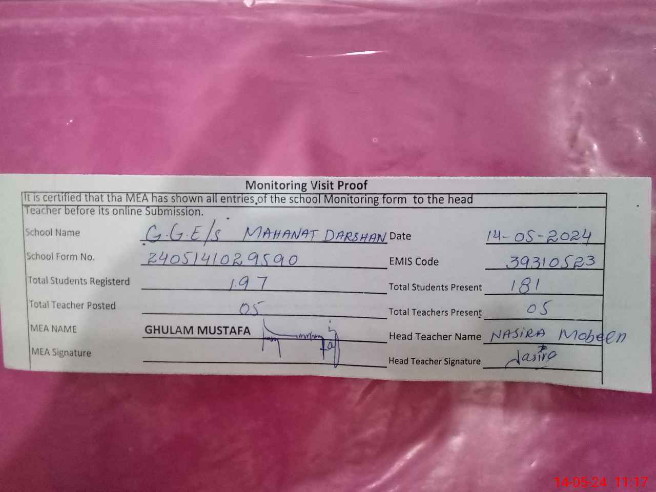 | Attendance Register | Head Teacher | MEA with School | Visit Proof |