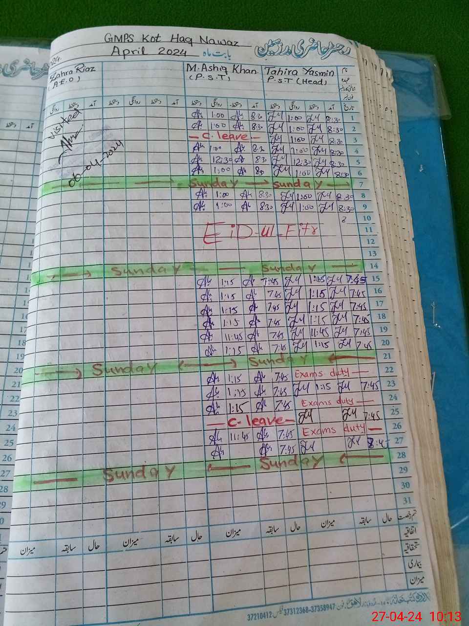 | CNIC | Full Name | Designation | R/C | Absence During Last Calender Month |