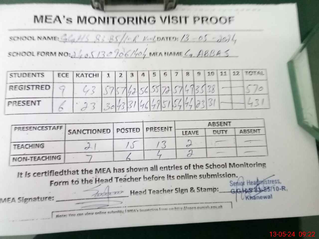 | Attendance Register | Head Teacher | MEA with School | Visit Proof |