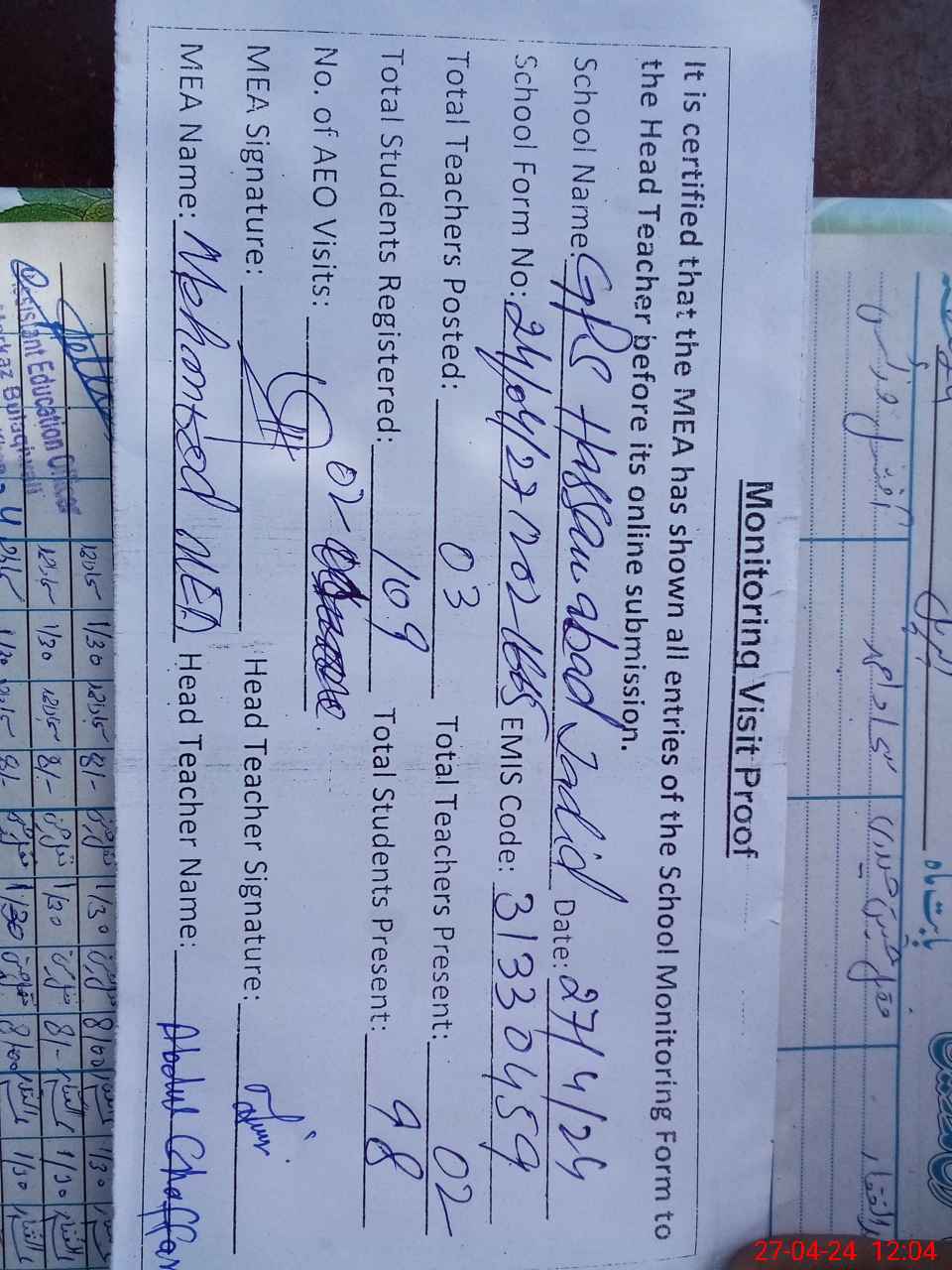 | EMIS Code: 31330459 | Name of School: GPS HASSAN ABAD JADID | |||