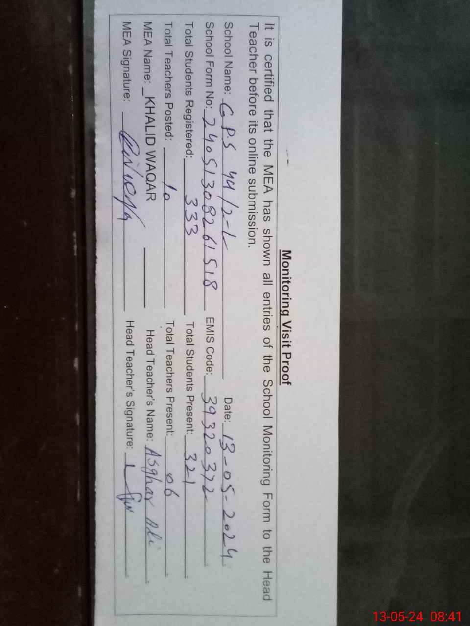 | Attendance Register | Head Teacher | MEA with School | Visit Proof |