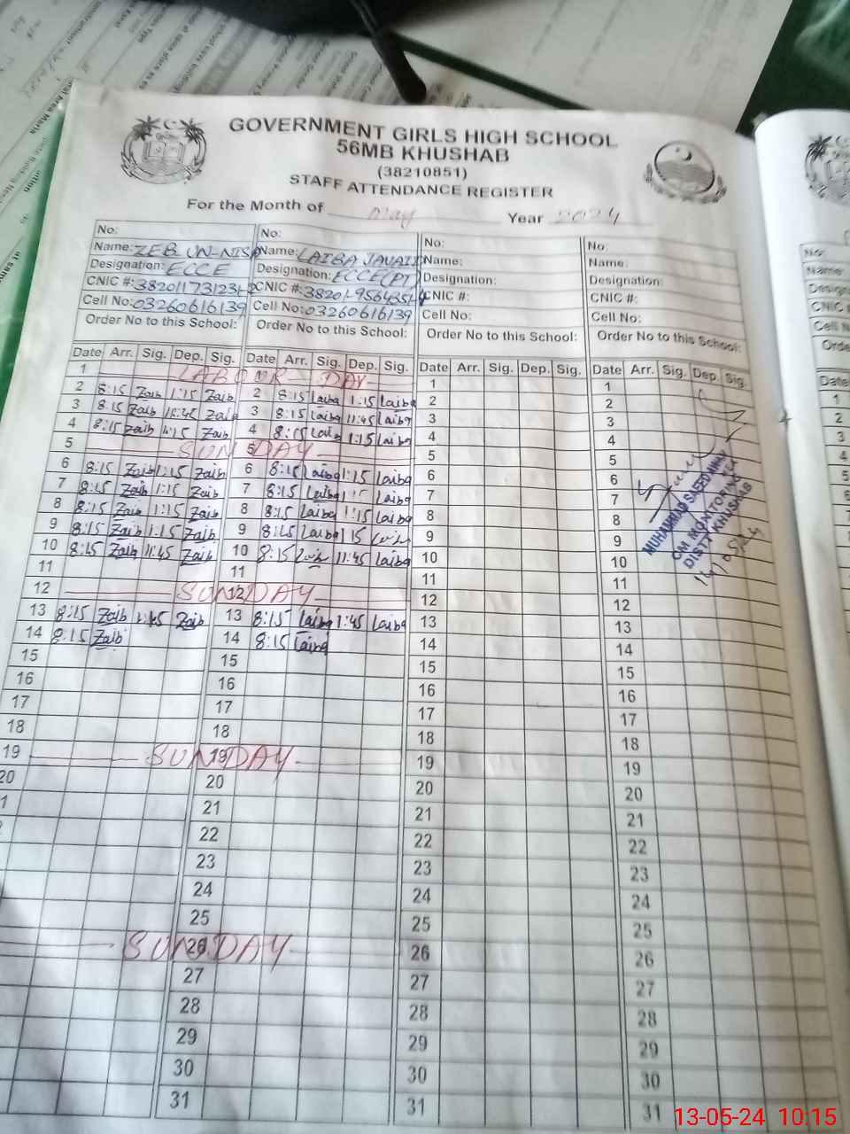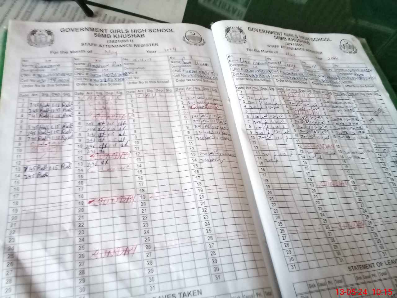 | CNIC | Full Name | Designation | R/C | Absence During Last Calender Month |