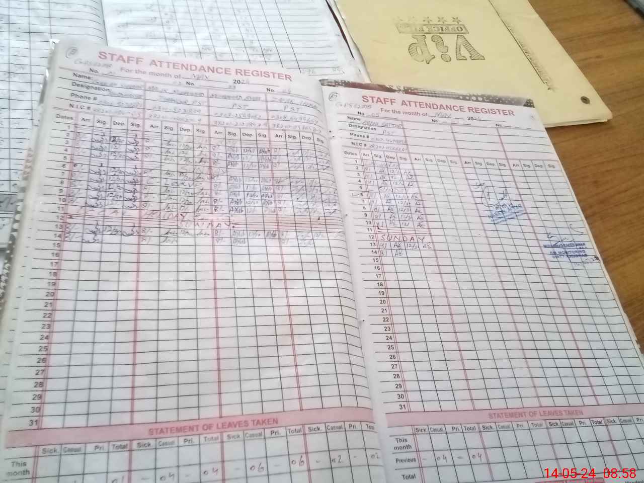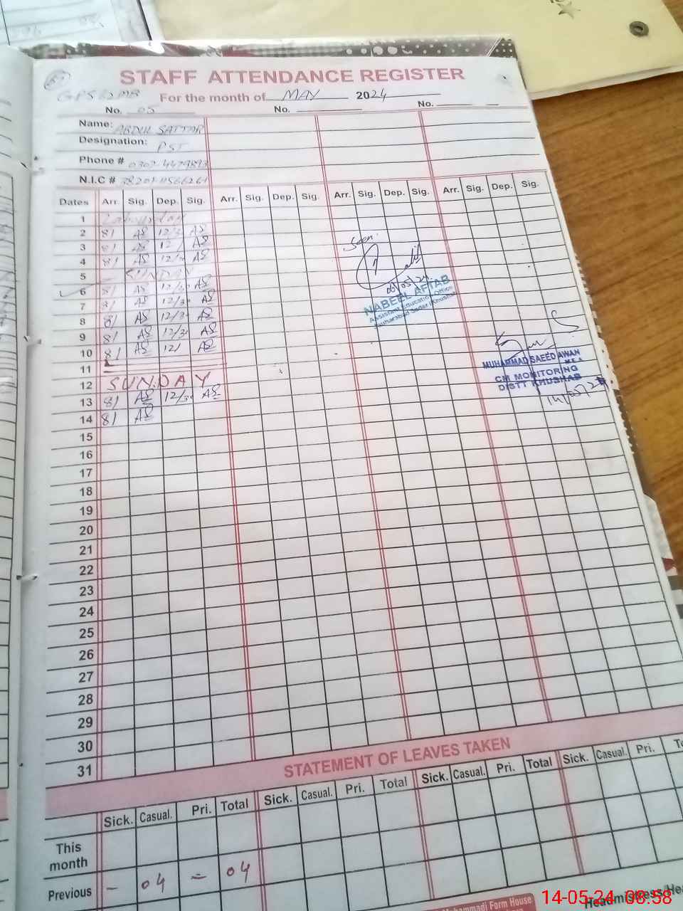 | CNIC | Full Name | Designation | R/C | Absence During Last Calender Month |