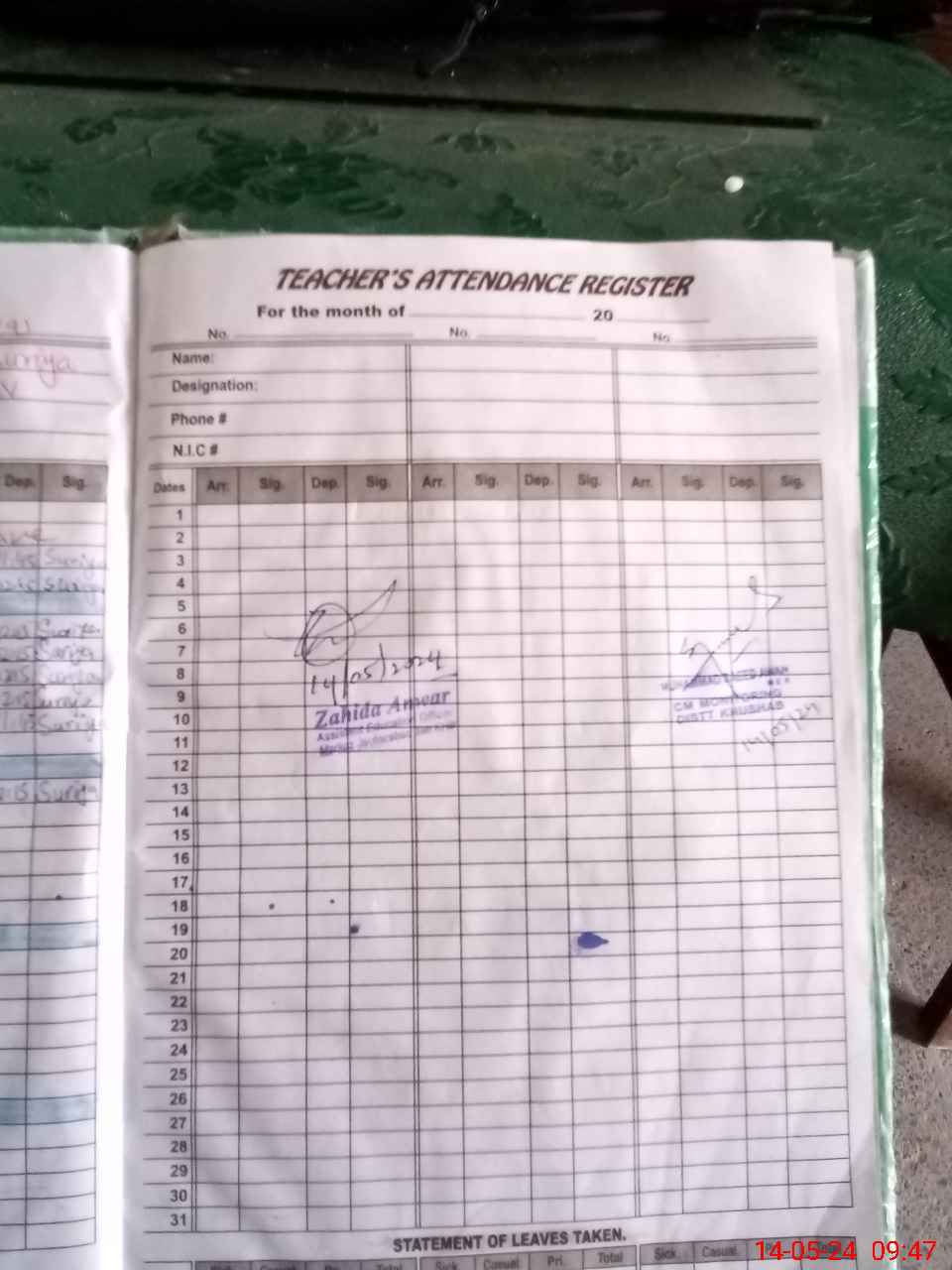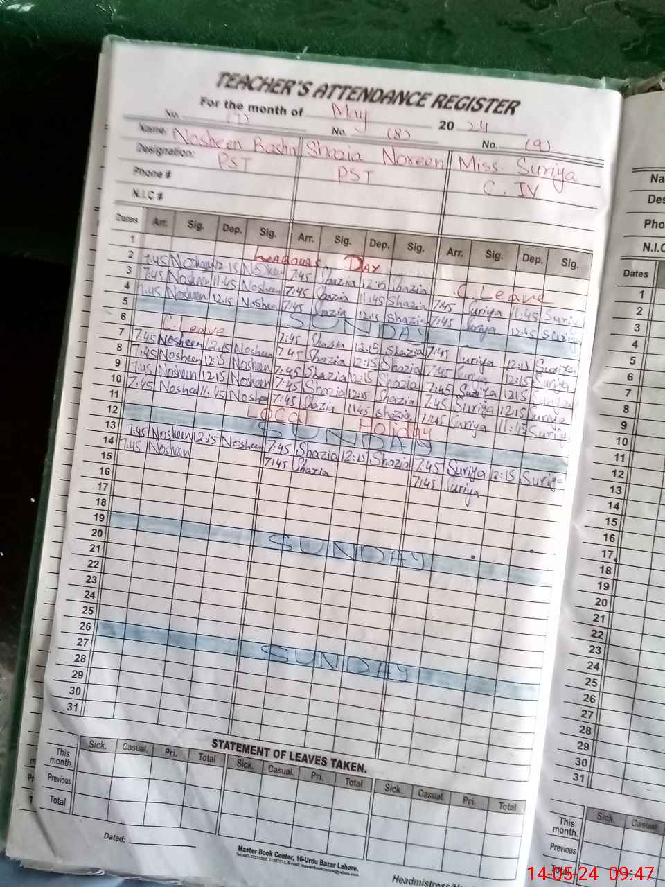 | CNIC | Full Name | Designation | R/C | Absence During Last Calender Month |