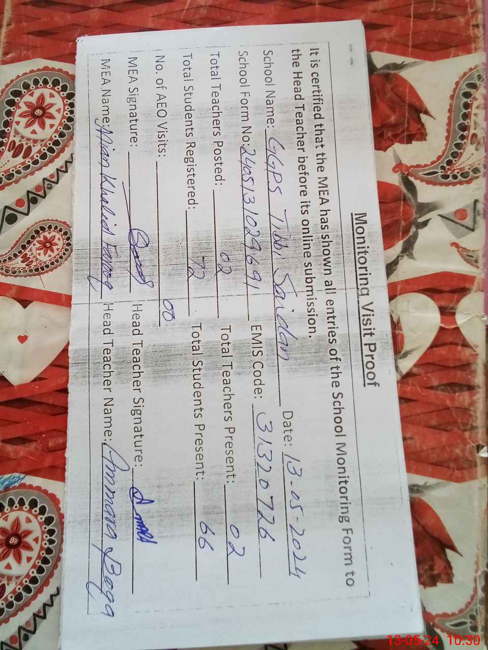 | Certified that this School was Inspected by the Undersigned MEA/DMO Today and the Information Stated Above is as Per Record. | |||||