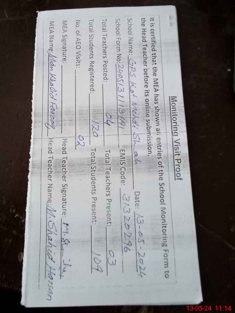 | EMIS Code: 31320296 | Name of School: GPS KOT MEHDI SHAH | |||