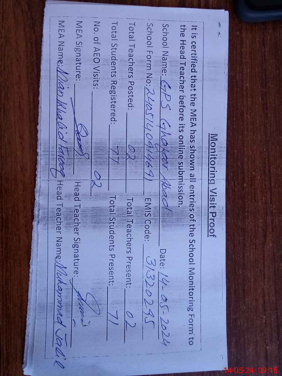 | Attendance Register | Head Teacher | MEA with School | Visit Proof |
