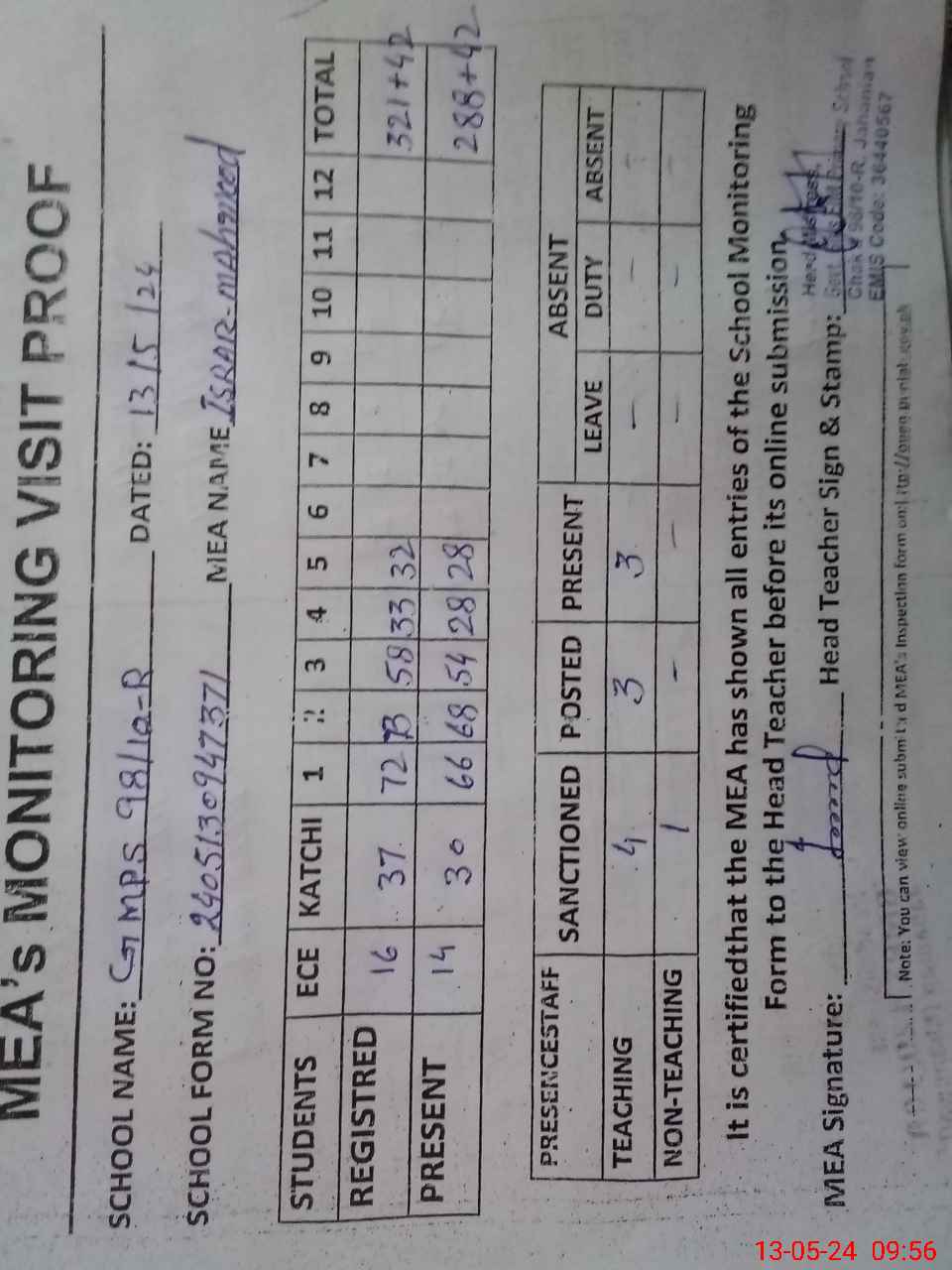 | Attendance Register | Head Teacher | MEA with School | Visit Proof |
