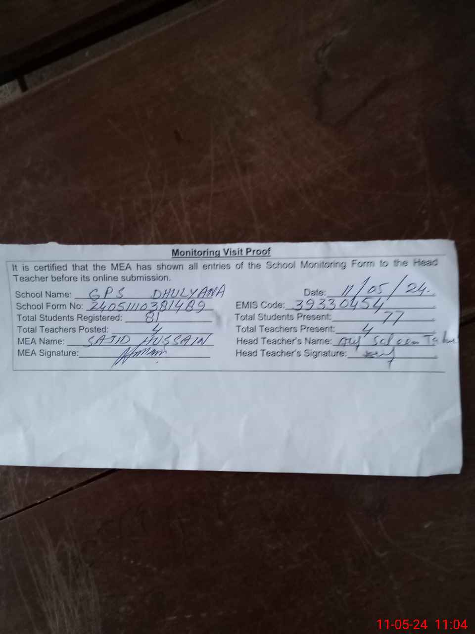 | Attendance Register | Head Teacher | MEA with School | Visit Proof |