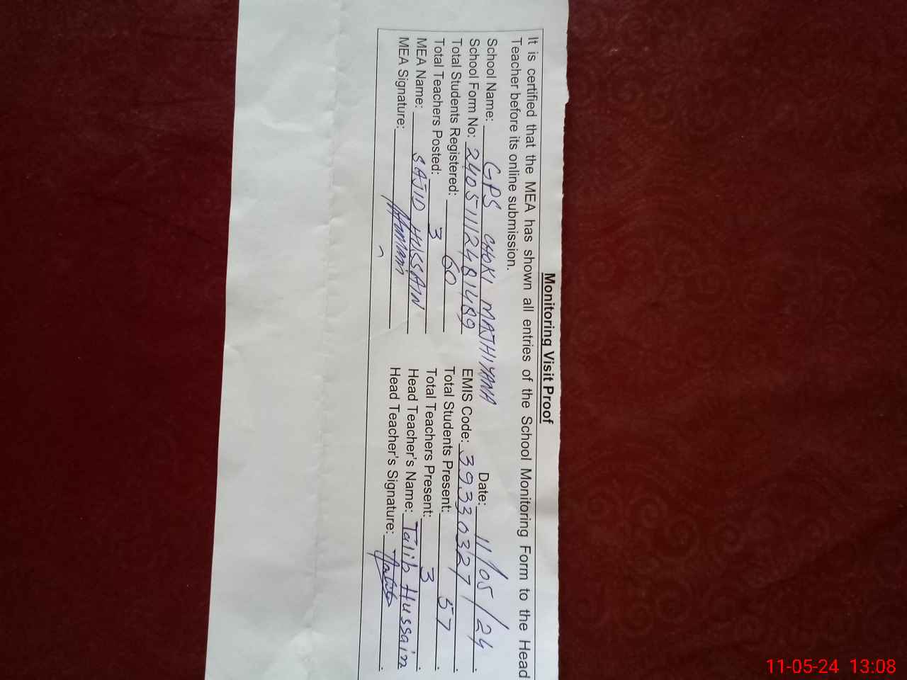 | Attendance Register | Head Teacher | MEA with School | Visit Proof |