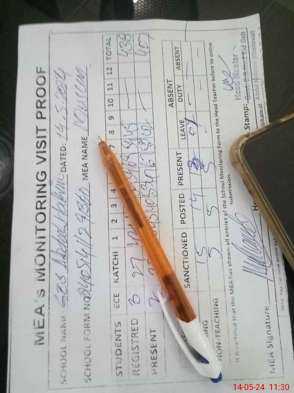 | Attendance Register | Head Teacher | MEA with School | Visit Proof |