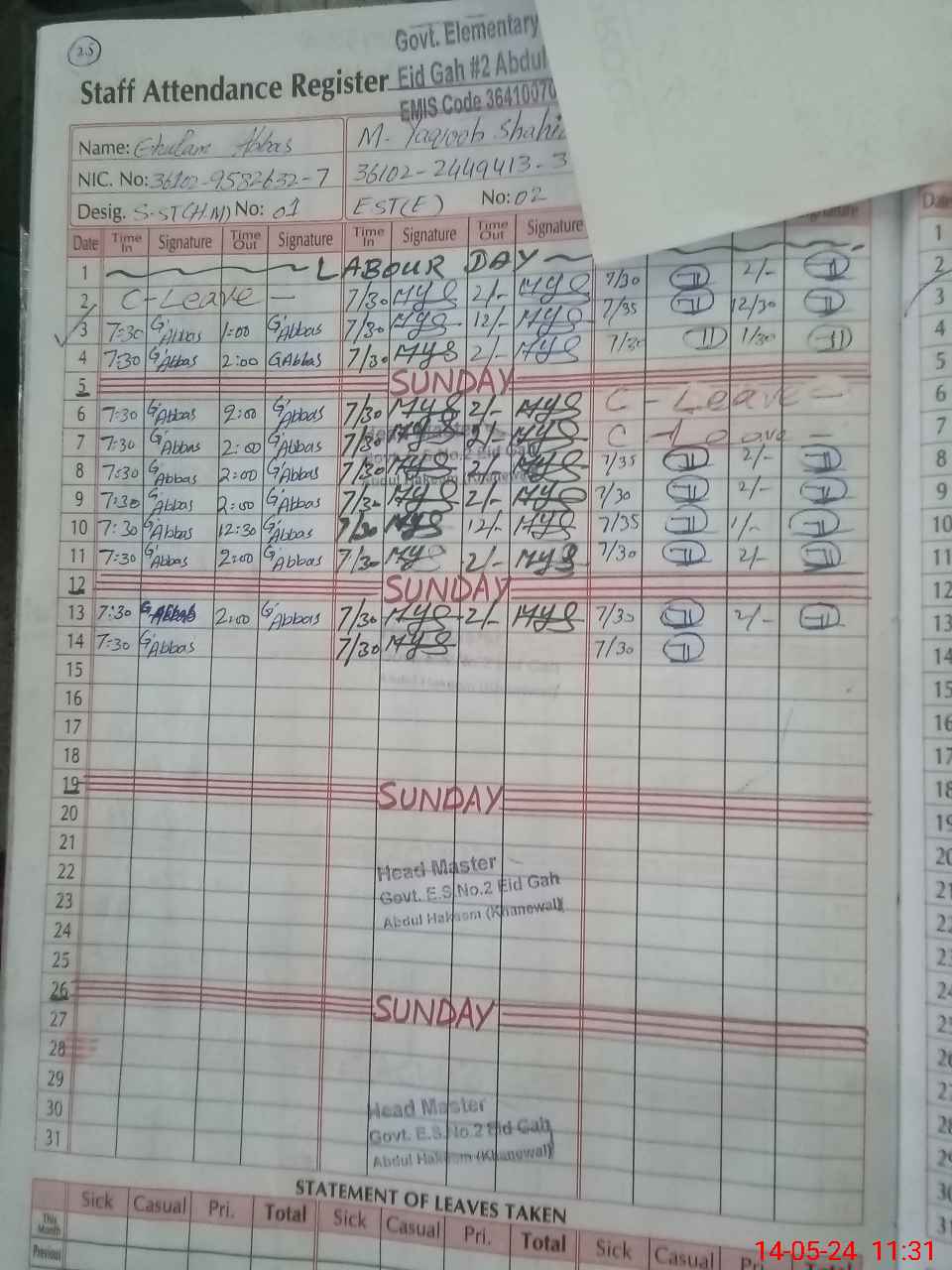 | CNIC | Full Name | Designation | R/C | Absence During Last Calender Month |