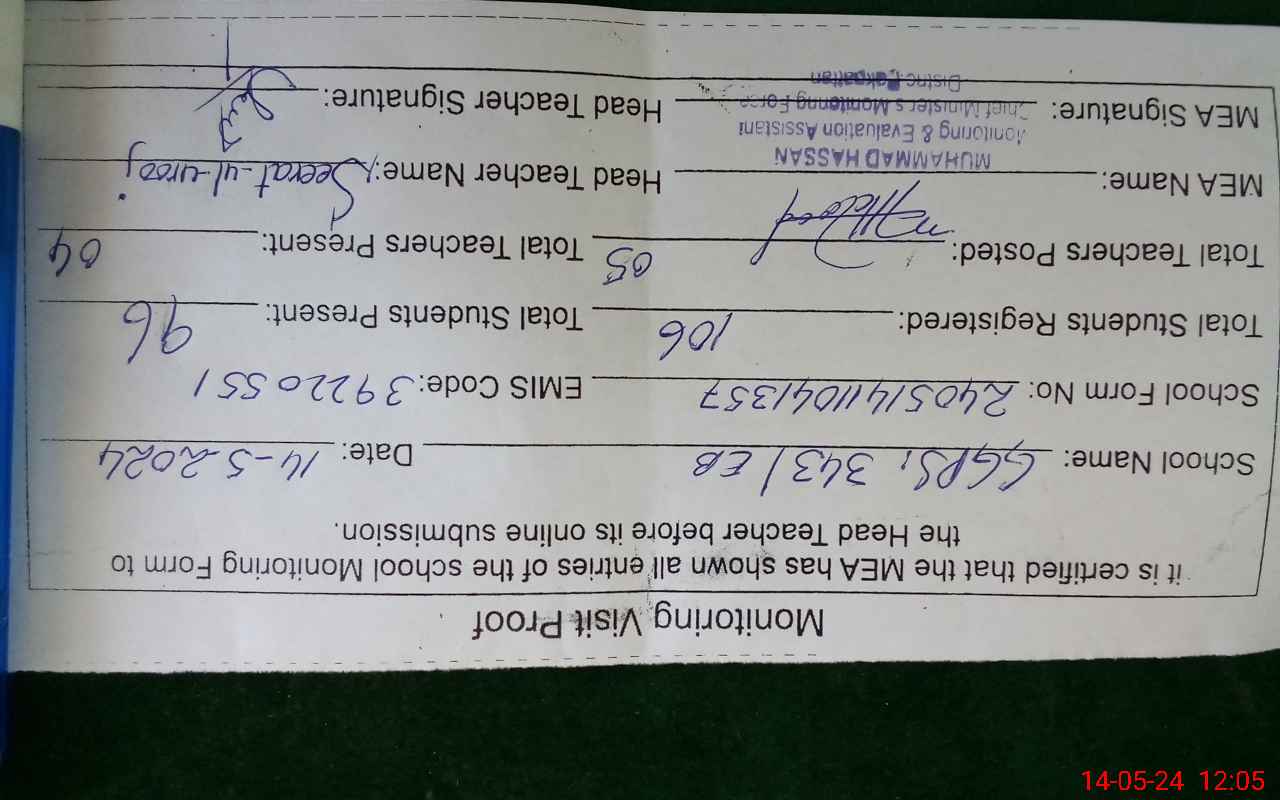 | Certified that this School was Inspected by the Undersigned MEA/DMO Today and the Information Stated Above is as Per Record. | |||||
