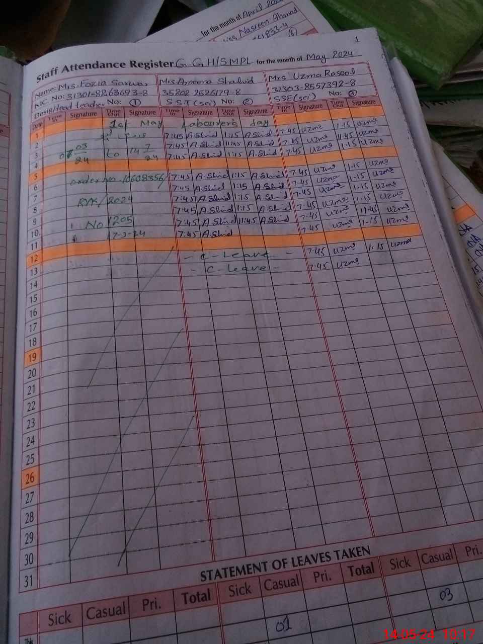 | CNIC | Full Name | Designation | R/C | Absence During Last Calender Month |