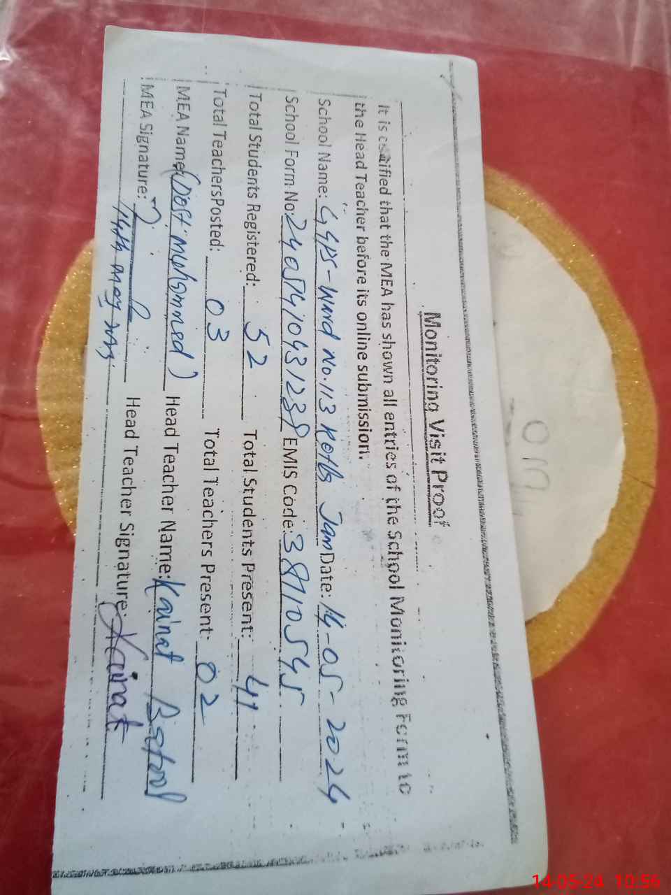 | Certified that this School was Inspected by the Undersigned MEA/DMO Today and the Information Stated Above is as Per Record. | |||||