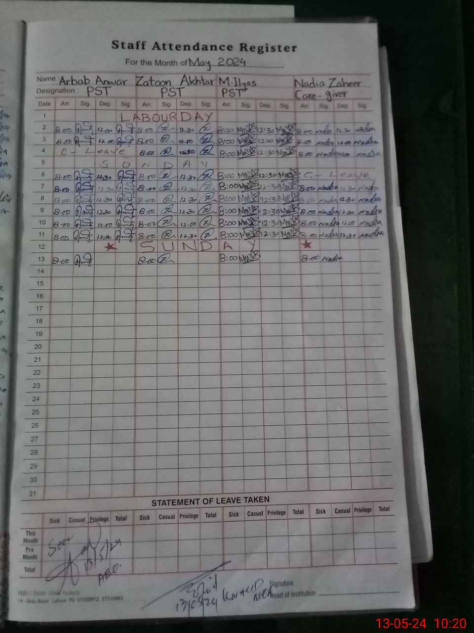 | CNIC | Full Name | Designation | R/C | Absence During Last Calender Month |