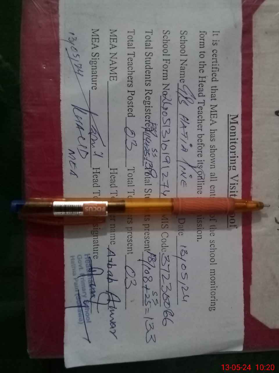 | Attendance Register | Head Teacher | MEA with School | Visit Proof |