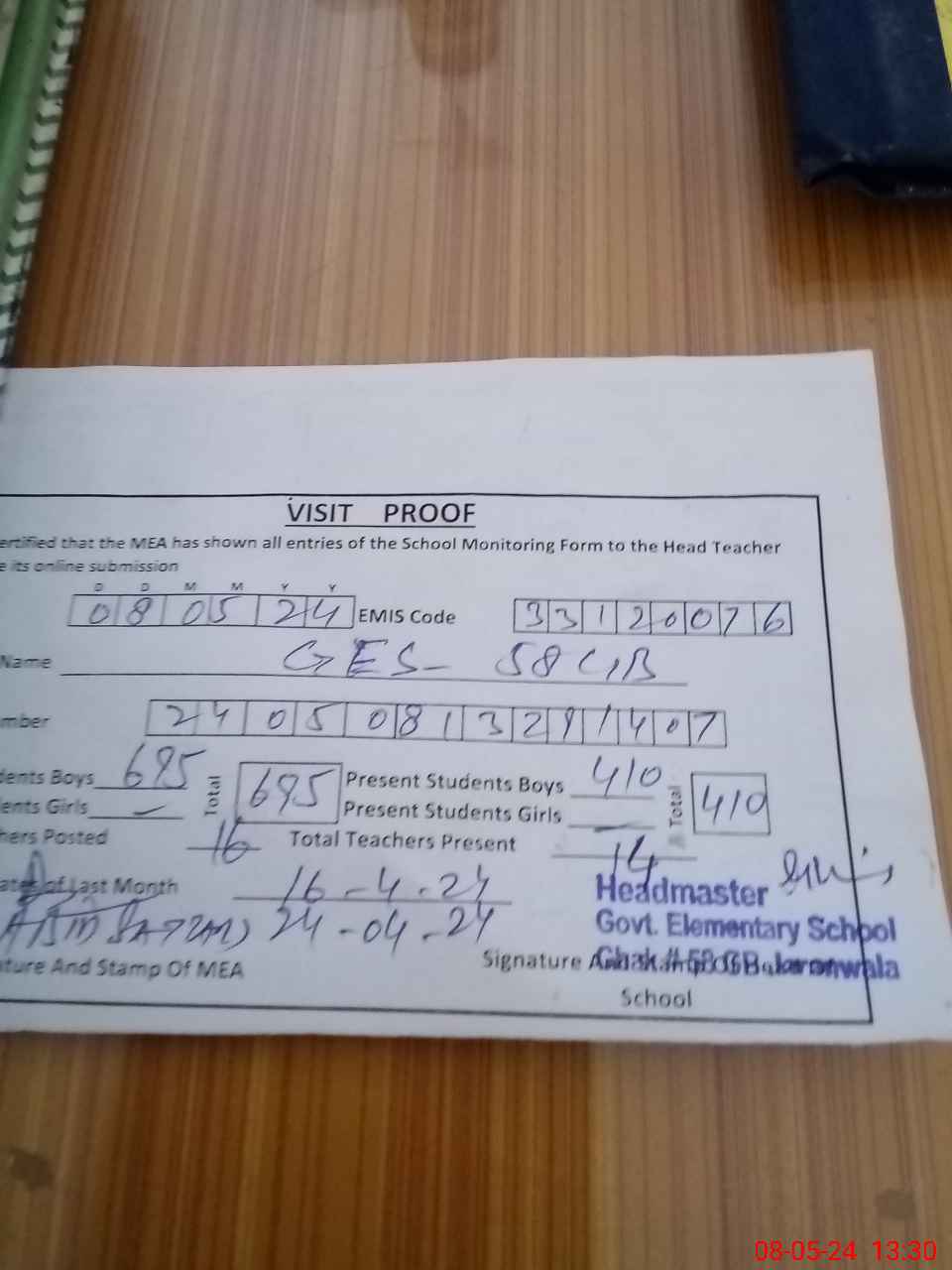 | Attendance Register | Head Teacher | MEA with School | Visit Proof |